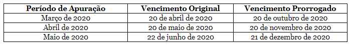 Os prazos de pagamento do Imposto sobre a Renda da Pessoa Jurídica (IRPJ), da Contribuição Social sobre o Lucro Líquido (CSLL), do Imposto sobre Produtos Industrializados (IPI), da Contribuição para o PIS/Pasep, da Contribuição para o Financiamento da Seguridade Social (COFINS) e da Contribuição Patronal Previdenciária (CPP) — no âmbito do Simples Nacional — foram prorrogados pelo Comitê Gestor do Simples Nacional, por meio da Resolução nº 152/2020, publicada na edição extra do Diário Oficial da União de 18 de março de 2020, em razão dos impactos da pandemia do Covid-19, conforme tabela abaixo: